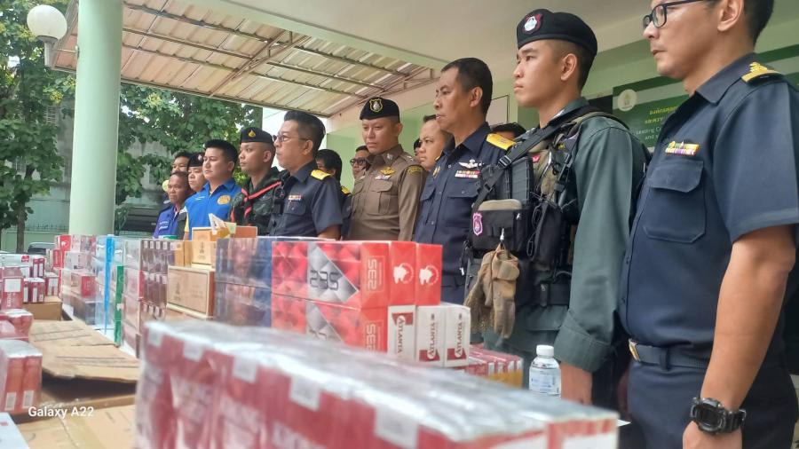 ด่านศุลกากรแม่สอด ร่วมหน่วยงาน ทหาร-ตำรวจ-ปกครอง แถลงข่าวจับบุหรี่เถื่อนและสินค้าหนีภาษี ยึดของกลางประเภทบุหรี่จํานวน 15713080 มวนมูลค่ากว่า 63 ล้านบาท