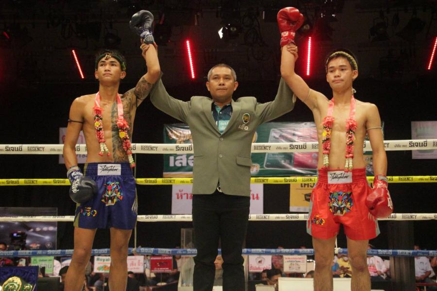 คู่ที่ 2. พลายพยัคฆ์ ทต.พลับพลานารายณ์ (แดง) พบกับ ยอดเหล็กแหลม พ.พิมพ์อร (พ.พิมพ์อร) พลายพยัคฆ์ มวยขวาเตี้ยสั้นหมัดหนัก ด้าน ยอดเหล็กแหลม มวยซ้ายสูงยาวเข่าแหลมปล้ำในรุนแรง เดินเข้าหาเตะซ้ายลำตัวหนักๆ พลายพยัคฆ์ พยามเตะขวาต่อยหมัดแต่ไม่รุนแรงกลับโดน ยอดเหล็กแหลม เดินปล้ำในจับคอตีเข่าเป็นชุดหนักทำเอา พลายพยัคฆ์ ถึงกับออกอาการกระทั่งต้นยก3 ยอดเหล็กแหลม ได้จังหวะเข้าจับคอตีเข่าเน้นๆ เป็นชุดทำเอา พลายพยัคฆ์ ทิ้งตัวลงไปนอนให้กรรมการนับ10 ทำให้ ยอดเหล็กแหลม ผ่านเข้าไปชิงชนะเลิศทันที ส่วน พลายพยัคฆ์ เข้าไปชิงที่ 3
