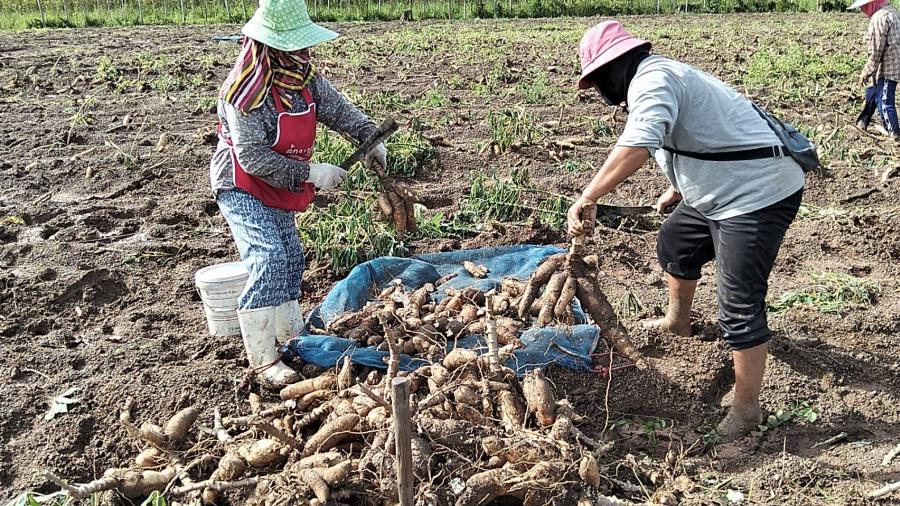 พื้นที่ไร่เป็นดินร่วนระบายน้ำได้ดี แต่ไม่สามารถนำรถบรรทุกเข้าในไร่ได้หากปล่อยทิ้งไว้อีก 2 วันหัวมันจะเน่าเสีย จึงต้องใช้แรงงานคนเดินลุยตมโคลนสับหัวมัน แล้วใช้รถไถทยอยออกจากสวนมาใส่รถบรรทุกด้านนอก วันนี้น่าจะเก็บหัวมันฯขายหนีฝนหมดเย็นนี้