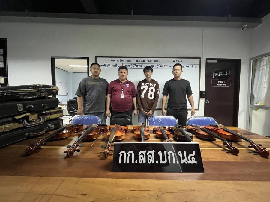 เจ้าหน้าที่ตำรวจจึงได้นำกำลังเข้าตรวจค้นและยึดของกลางเพิ่มเติมได้อีกเป็นจำนวนมาก ทั้ง ไวโอลินโบราณยี่ห้อ Kisosozaki violno co 1720 และ กีตาร์ Yamaha พร้อมกล่อง