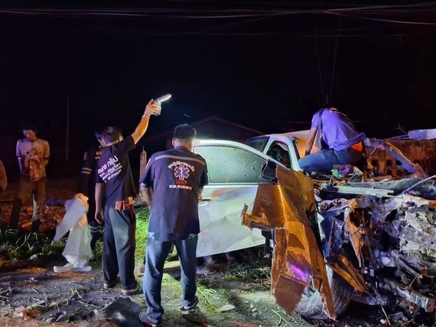 หนุ่มใหญ่วัย 36 ซิ่งกระบะเสียหลักพุ่งชนกำแพงดังสนั่นดับคาซากรถ