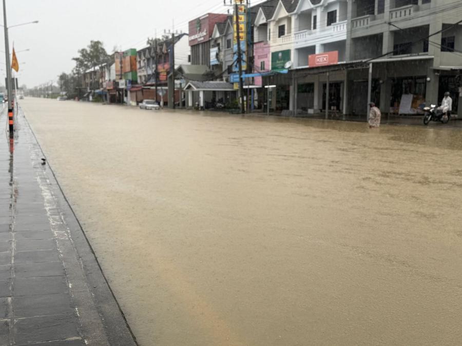 ที่ จ.พังงา ผู้สื่อข่าวรายงานสถานการณ์น้ำท่วมในพื้นที่เขาหลัก ต.คึกคัก อ.ตะกั่วป่า หลังจากฝนตกหนักต่อเนื่อง ส่งผลให้น้ำป่าจากเทือกเขาวง ไหลเข้าท่วมถนนเพชรเกษม สายตะกั่วป่า–ท้ายเหมือง อย่างหนักโดยระดับน้ำบนถนนเพชรเกษม ตั้งแต่หนองมูลตะกั่วจนถึงซอยนายเท่ง สูงประมาณ 30–50 เซนติเมตร รถเล็กสัญจรผ่านไปมาด้วยความยากลำบาก และบางช่วงเกิดการจราจรติดขัดเป็นทางยาว ซึ่งทางตำรวจ สภ.เขาหลักหน่วยกู้ภัย และเทศบาล ต.คึกคัก ต้องเร่งอำนวยความสะดวกด้านการจราจรให้กับประชาชนและนักท่องเที่ยวที่ใช้เส้นทางดังกล่าว