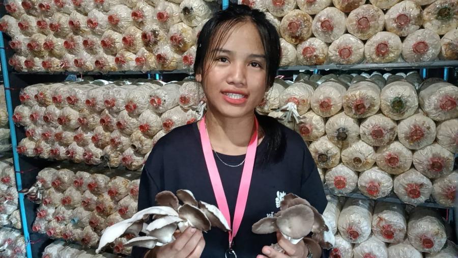 นางสาวทิพย์อาภา ช่างแกะ (น้องอุ้ม) อายุ 23 ปี สาวโรงงานวัย 23 ปี หันมาประกอบอาชีพเสริมด้วยการทำเห็ดนางฟ้าภูฐานสร้างรายได้เพิ่มนอกเหนือจากมีรายได้ประจำ โดยก่อนเข้าทำงานโรงงานจะตื่นเก็บเห็ดแต่เช้า เก็บเห็ดในโรงเรือนจากนั้นนำเห็ดมาตัดตีนเห็ดออกแล้วใส่ถุงช่างเป็นกิโลกรัม