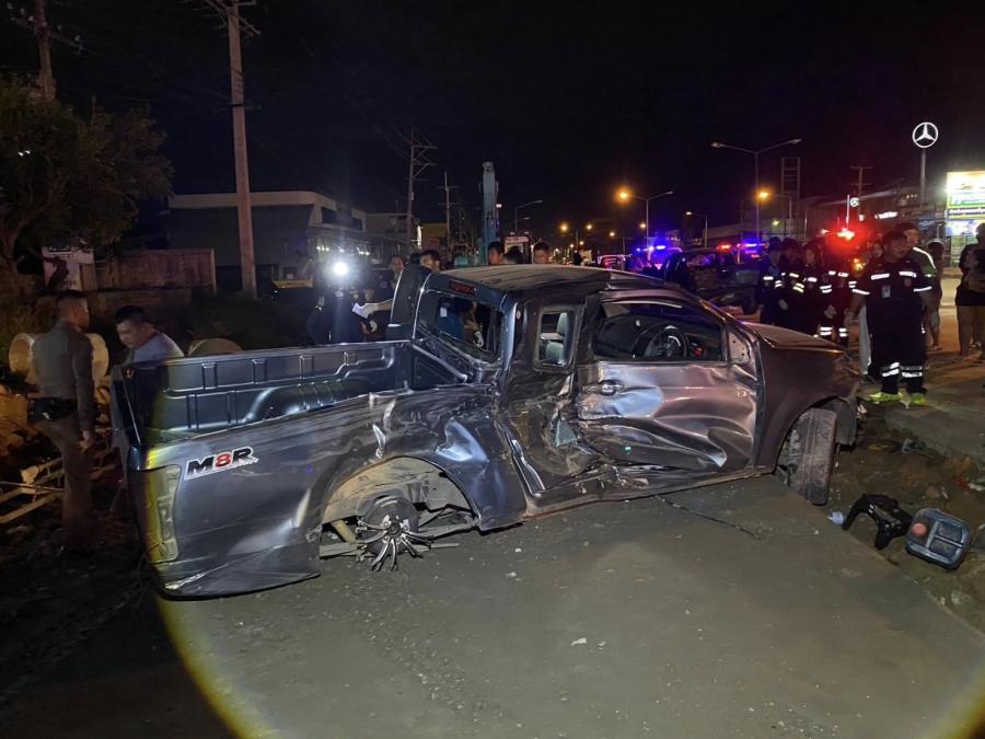 สลด!กระบะซิ่งพุ่งชนจยย.-รถจอดข้างทาง-คนงานก่อสร้างถนน ตาย 3 เจ็บ 7