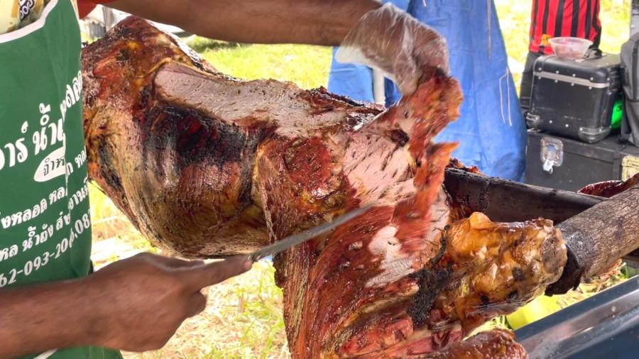 ทั้งนี้ เมื่อแล่เนื้อบางๆ จนทั่วตัวแล้ว ก็จะนำไปย่างไฟใหม่อีกประมาณครึ่งชั่วโมง กระทั่งเมื่อเนื้อภายนอกร้อนจัด ก็นำน้ำซอสที่เตรียมไว้ไปทาบริเวณผิวของเนื้อวัวให้ทั่วตัวอีกครั้ง และเมื่อได้ที่ก็ยกมาแล่เอาเนื้อส่วนบนบางๆ เสิรฟ์ ทำวนแบบนี้จนหมดทั้งตัว ซึ่งวัว 1 ตัว สามารถแล่ได้ 4-5 รอบ ใช้เวลาย่างไม่ต่ำกว่า 3-4 ชม. จึงจะหมดทั้งตัว โดยคนที่ได้ทาน ต่าง ยกนิ้วให้ อร่อยจริง