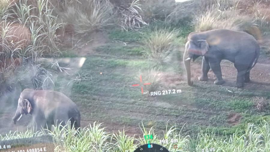 นายจิรภัทร ท่าข้าม จิตอาสาเฝ้าระวังช้างป่าตำบลลาดตะเคียน กล่าวว่า ได้รับแจ้งว่าช้างพังยุ้งข้าวของประชาชนจึงรีบออกไปตรวจสอบบริเวณข้างบ้านหลังดังกล่าวและพบช้าง 2 ตัวหัวสูงใหญ่มาก อยู่ห่างจากบ้านประชาชนประมาณ 300 เมตร จึงใช้โดรนจับความร้อนบินสำรวจดูพบว่าช้าง 2 ตัว อยู่ในป่าอ้อยและชนกันอยู่ในป่าอ้อยและหนีเข้าป่าไป กระทั่งช่วงเช้าที่ผ่านมาได้นำโดรนบินสำรวจจึงพบช้าง 2-3 ตัวอยู่ในป่าอ้อยข้างฟาร์มหมูซึ่งห่างจากบ้านเรือนประชาชนประมาณ 500 เมตร ซึ่งได้ทำการผลักดันเจ้าแข็งแกร่งและเจ้างาบิดออกจากพื้นที่ดังกล่าวเพื่อความปลอดภัย