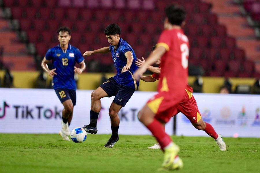 นาที 25 ไทยเกือบได้ประตูนำห่าง จากจังหวะยิงไกลของ อิคลาส สันหรน และไปแฉลบแนวรับเวียดนาม แต่ประตูยังเซฟไว้ได้