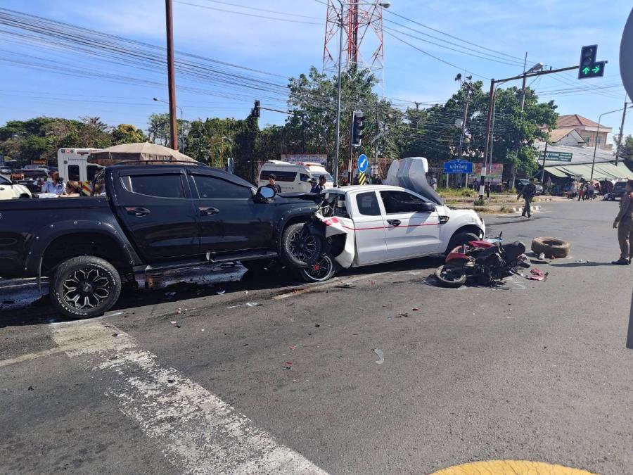 ประเดิมก่อนถึง 7 วันอันตราย ชนวินาศสันตะโรไฟแดง กระบะพุ่งชนอัดท้ายกระบะจอดติดสัญญาณกระเด็นไปเสยคันหน้ากระแทกอัดจยย. 2 คัน บาดเจ็บ 10 เสียชีวิต 1 ราย