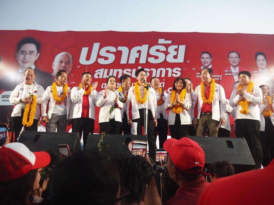โดยมี นายพานทองแท้ ชินวัตร บุตรชายนายทักษิณ ชินวัตร อดีตนายกรัฐมนตรี นายจักรภพ เพ็ญแข ผู้สมัคร สส.แบบบัญชีรายชื่อ นายณัฐวุฒิ ใสยเกื้อ ผู้ช่วยหาเสียง พรรคเพื่อไทย ขึ้นเวทีปราศรัยในครั้งนี้ด้วย โดยมีผู้สมัคร สส. ทั้ง 8 เขต ได้แก่ เขต 1 นายอัครวัฒน์ อัศวเหม เบอร์ 3 / เขต 2 ดร.ยงยุทธ สุวรรณบุตร เบอร์ 8 / เขต 3 นายภิญโญ กิจเลิศไพโรจน์ เบอร์ 3/ เขต 4 พ.ต.อ.กรวัฒน์ หันประดิษฐ์ เบอร์ 7/ เขต 5 นายปิยะพงษ์ เหมมะ เบอร์ 9/ เขต 6 นางนฤมล ธารดำรงค์ เบอร์ 8/ เขต 7 นายประชา ประสบดี เบอร์ 7/ เขต 8 นางสลิลทิพย์ สุขวัฒน์ เบอร์ 7 ขึ้นเวทีปราศรัยด้วยเช่นกัน