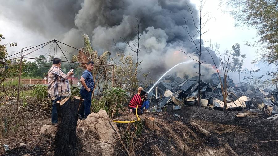 นางพัชรีพรรณ ทองใบ เจ้าของบ้าน กล่าวว่า ไฟที่ไหม้มันเป็นตู้เย็นเก่าที่ไม่ผ่าน QC เพื่อนบ้านที่สนิทกันไปประมูลมาจากโรงงาน ซึ่งเพื่อนบ้านที่นำมาฝากไว้เนื่องจากโกดังมันเต็ม เขาเห็นพื้นที่ของเราว่างจึงนำมาฝากไว้ถ้าเคลียร์โกดังว่าง ก็จะเอาไปคัดแยกชิ้นส่วนขายขายให้โรงงานประมาณนี้ ไม่รู้ว่าไฟมันมาจากทางไหนไม่รู้เพราะไปทำงานมาก็เห็นไฟไหม้แล้ว