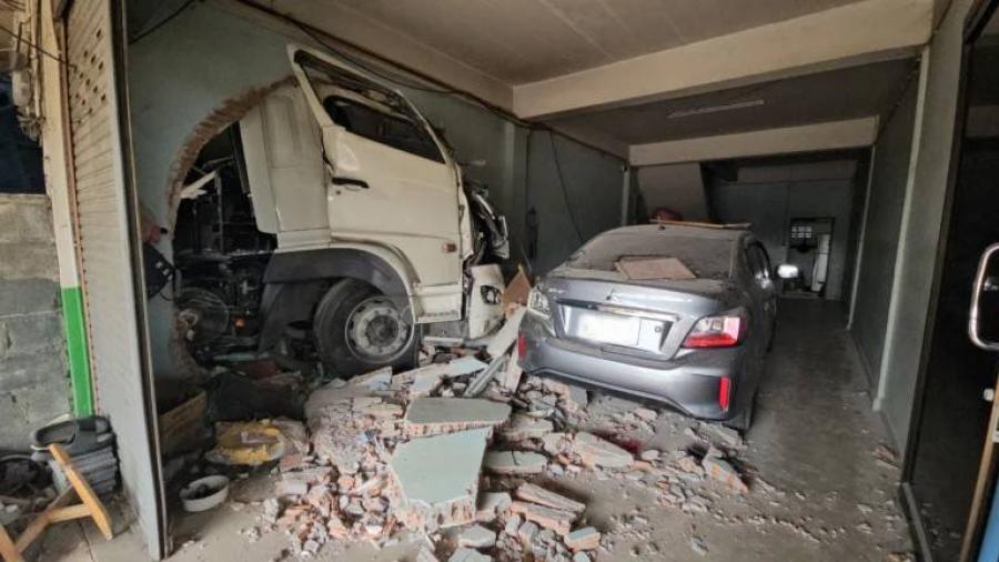 ระทึกกลางเมืองบางละมุง!พ่วง 18 ล้อพุ่งทะลุตึก 4 ชั้นร้านส้มตำพังยับเจ็บ 2