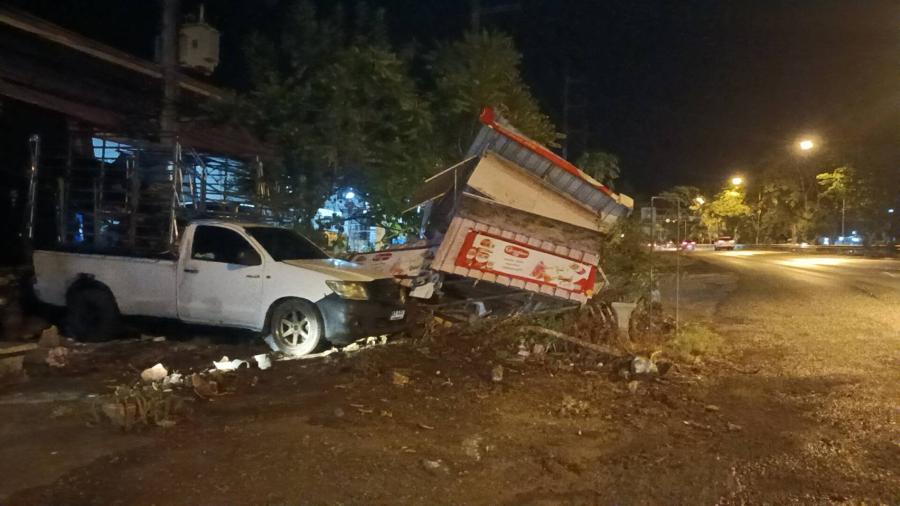 ปราจีนบุรีฝนตกถนนลื่นกระบะเสียหลักพุ่งชนร้านค้าริมทางเสียหายยับโชคดีไร้เจ็บตาย
