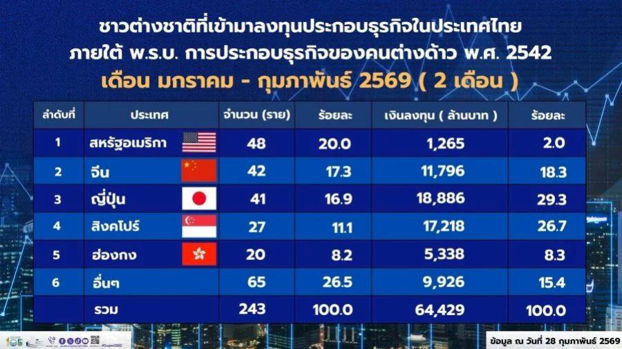 เฉพาะเดือนกุมภาพันธ์ 2569 มีการอนุญาตให้ต่างชาติประกอบธุรกิจ 130 ราย มูลค่าการลงทุน 30650 ล้านบาท โดยนักลงทุนส่วนใหญ่มาจาก สหรัฐอเมริกา จีน และญี่ปุ่น