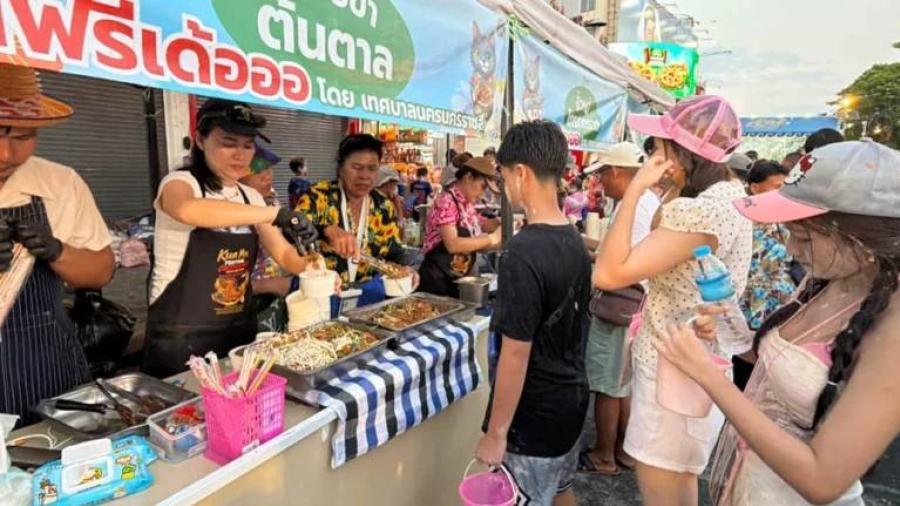 ภาพที่เห็นชัดคือแถวยาวเหยียดของประชาชนที่ตั้งใจมารอชิมของดีประจำถิ่น บางช่วงต้องใช้เวลารอหลายสิบนาที ทว่าไม่มีใครถอย เพราะรางวัลที่รออยู่คือ “ผัดหมี่โคราชร้อนจากกระทะ” ที่ขึ้นชื่อเรื่องรสชาติเข้มข้น