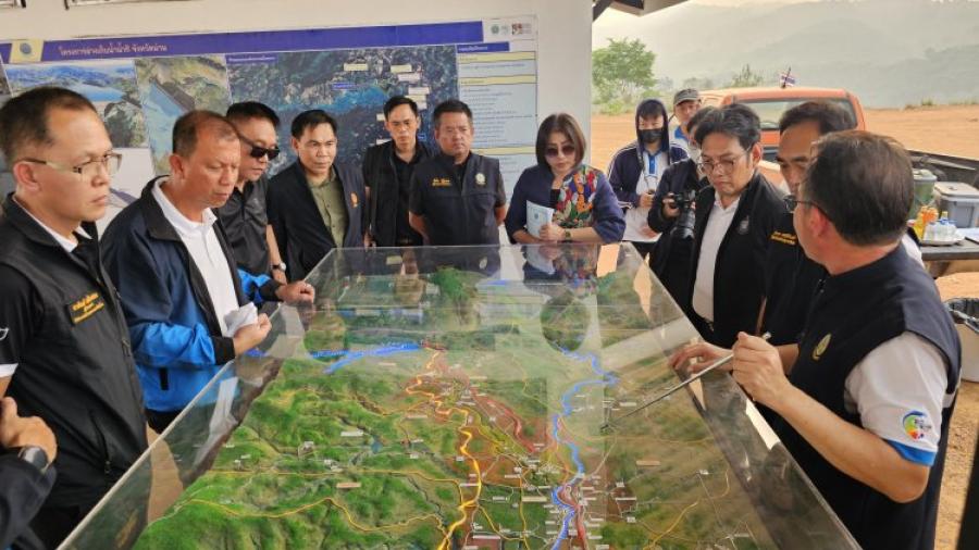 จากนั้นคณะทำงานฯ ได้ตรวจเยี่ยมโครงการขุดลอกต่างตอบแทนและการสำรวจเส้นทางก่อสร้างโครงการบายพาสน้ำน่านบริเวณใกล้เคียงฝายธงน้อย โดยมีเจ้าหน้าที่จากกรมชลประทานและหน่วยงานท้องถิ่นร่วมให้ข้อมูลเชิงลึกถึงกระบวนการระบายน้ำและการเพิ่มพื้นที่รับน้ำ เพื่อเตรียมพร้อมรับมือกับมวลน้ำหลากในช่วงฤดูฝนที่กำลังจะมาถึง