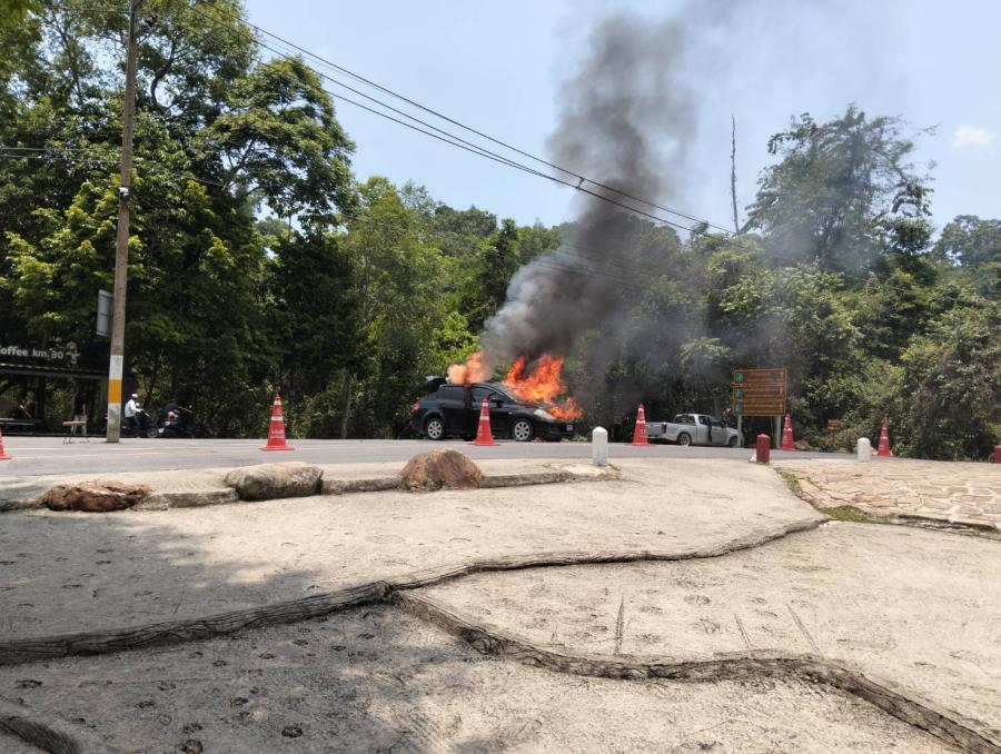 จากการสอบถาม น.ส.เอ (นามสมมติ) อายุ 26 ปี ชาวจังหวัดกำแพงเพชร เจ้าของรถ เล่านาทีระทึกว่า ตนได้ขับรถขึ้นมาท่องเที่ยวพักผ่อนบนอุทยานฯ เมื่อถึงจุดชมวิวได้เลี้ยวเข้าจอดเพื่อแวะถ่ายภาพ ทันใดนั้นสังเกตเห็นควันพุ่งออกมาจากฝากระโปรงรถอย่างผิดปกติ และเพียงครู่เดียวก็มีเปลวไฟพุ่งพรึ่บออกมาอย่างรวดเร็ว ตนจึงรีบตัดสินใจวิ่งหนีตายออกจากรถทันที ก่อนที่ไฟจะโหมลุกไหม้จนท่วมทั้งคัน